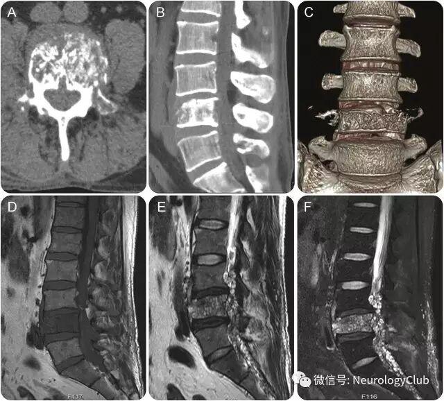 (图2:A-C:腰椎CT可见L4椎体广泛破坏;D-F:T1WI,T2WI和T2短时间反转恢复序列可见L3-S2水平不均匀信号肿块侵袭伴L4椎体破坏)