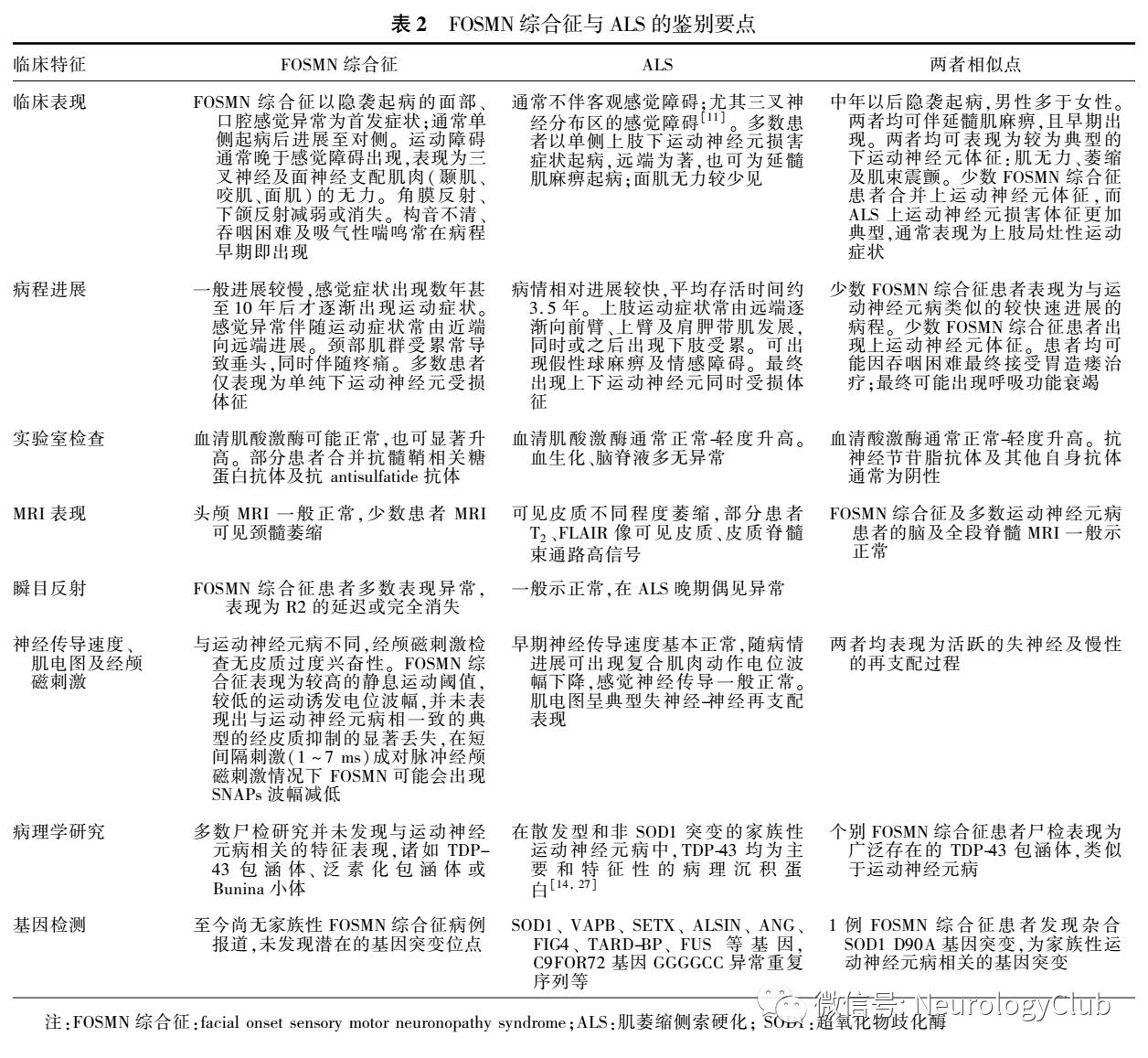 2. 分子遗传学证据:FOSMN综合征的分子遗传学研究同样证实了与ALS之间可能的联系。Dalla等报道了迄今唯一1例散发的FOSMN综合征患者合并超氧化物歧化酶1(superoxide dismutase 1,SOD1) 基因D90A杂合突变的病例,同时该患者的TARDBP、FUS基因及C9ORF72多聚核苷酸序列检测示正常,为FOSMN综合征的分子遗传学研究带来了新的启示。目前已知约25%的家族性ALS和1%-5%的散发性ALS与SOD1基因突变相关。D90A-SOD1突变作为最为常见的突变类型,纯合D90A突变已经被证实与慢性进展的ALS相关。当为杂合型时,ALS患者可能有各不相同的外显率(一般较低)及临床的表现型,包括麻木、感觉异常及疼痛等感觉异常,神经电生理及腓神经活体组织检查(简称活检)的异常。该发现从分子遗传学角度揭示了FOSMN综合征与ALS之间的联系。基于ALS患者经常表现为无临床意义的躯体感觉系统异常,Dalla等提出了FOSMN的本质仍为同时累及了三叉神经及背根神经节感觉神经元的ALS变异型这一假说,即FOSMN可能为ALS的缓慢进展并早期出现面部、上肢感觉症状的变异型。