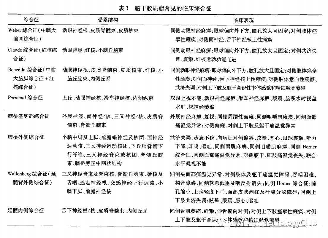BSG的常见临床表现包括:脑神经功能障碍、长束征和共济失调。脑神经功能障碍是脑神经纤维或核团损伤所导致,可反映肿瘤的部位和累及范围,具有定位诊断价值。长束征是指脑干内长的纵行纤维束受累所表现出的临床征象,主要包括皮质脊髓束损伤导致的对侧肢体痉挛性瘫痪、肌张力增高、腱反射亢进、病理征阳性;脊髓丘脑束损伤导致的对侧肢体粗略触压觉和痛温觉异常;内侧丘系损伤导致的对侧肢体意识性本体感觉和精细触觉异常。共济失调主要为小脑脚损伤所致,内侧丘系损伤可导致感觉性共济失调。BSG常见的临床综合征见表1。肿瘤阻塞脑脊液循环通路后可形成幕上脑积水,出现头痛、呕吐、视盘水肿或视神经萎缩等颅内压增高的表现。