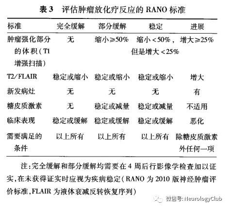 推荐采用2010版神经肿瘤评价标准(response assessment in neuro-oncology,RANO)评估肿瘤对放化疗的反应(表3)。
