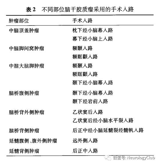 3. 手术方案的制定:不同部位的BSG常用的手术入路见表2。脑干安全进入点的选择至关重要,建议在纤维束导航及术中神经电生理监测的引导下避开脑干内重要的传导束和核团,选择脑干表面离肿瘤最近的区域进入,应沿纤维束走形方向切开脑干,避免对纤维束过多的损伤。术中尽可能减少对脑干的机械牵拉,尽可能避免对脑干正常供血动脉和引流静脉的损伤。