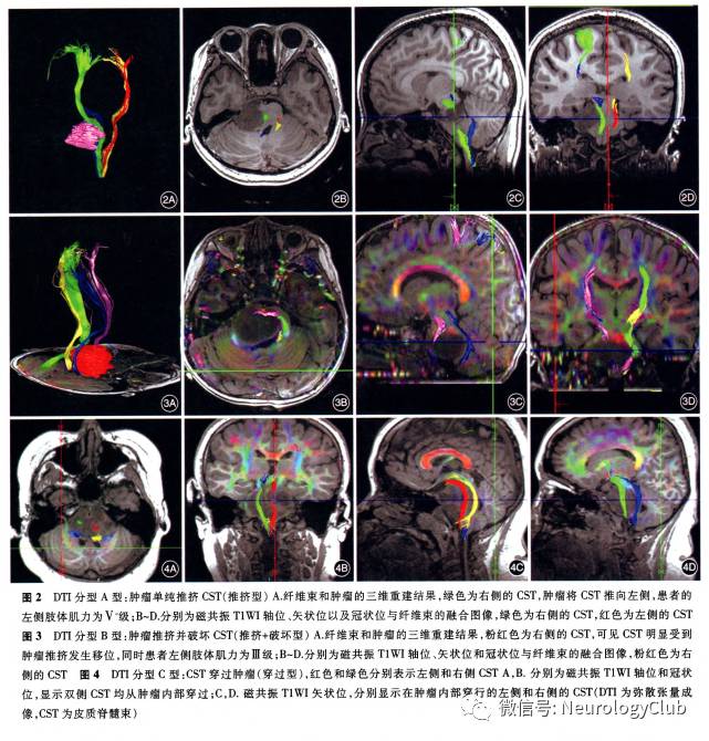 C型:为穿过型,CST从肿瘤内部穿过,患者受累肢体肌力为III-V级(图4)。