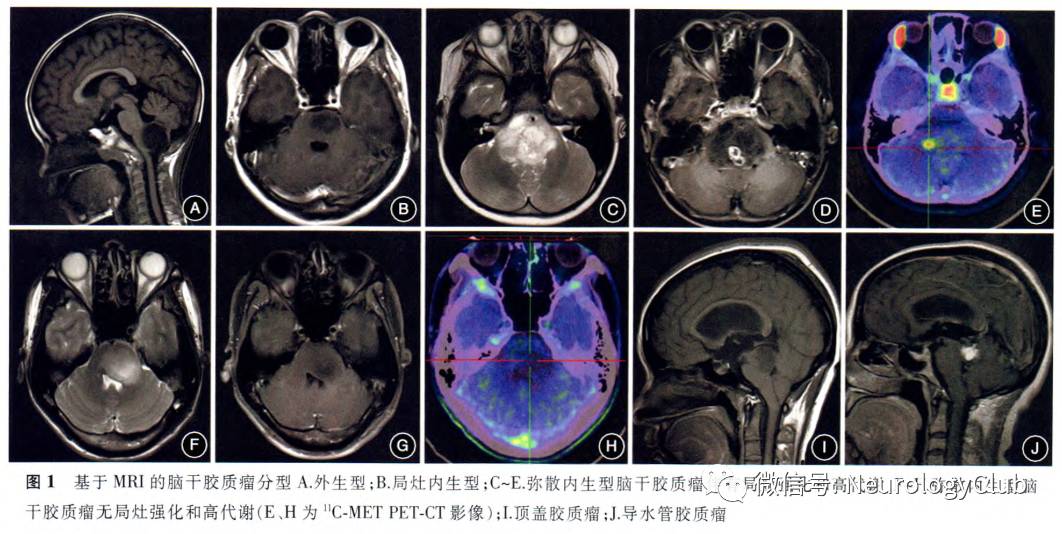III型:为特殊类型的BSG,IIIa型为顶盖胶质瘤(图1I);IIIb型为导水管胶质瘤,其发生率较低,以梗阻性脑积水为首发症状,病理类型以低级别胶质瘤为主(图1J);IIIC型为NF1相关的BSG,可分布在脑干内任何部位,可表现出各种生长方式和影像学特点。