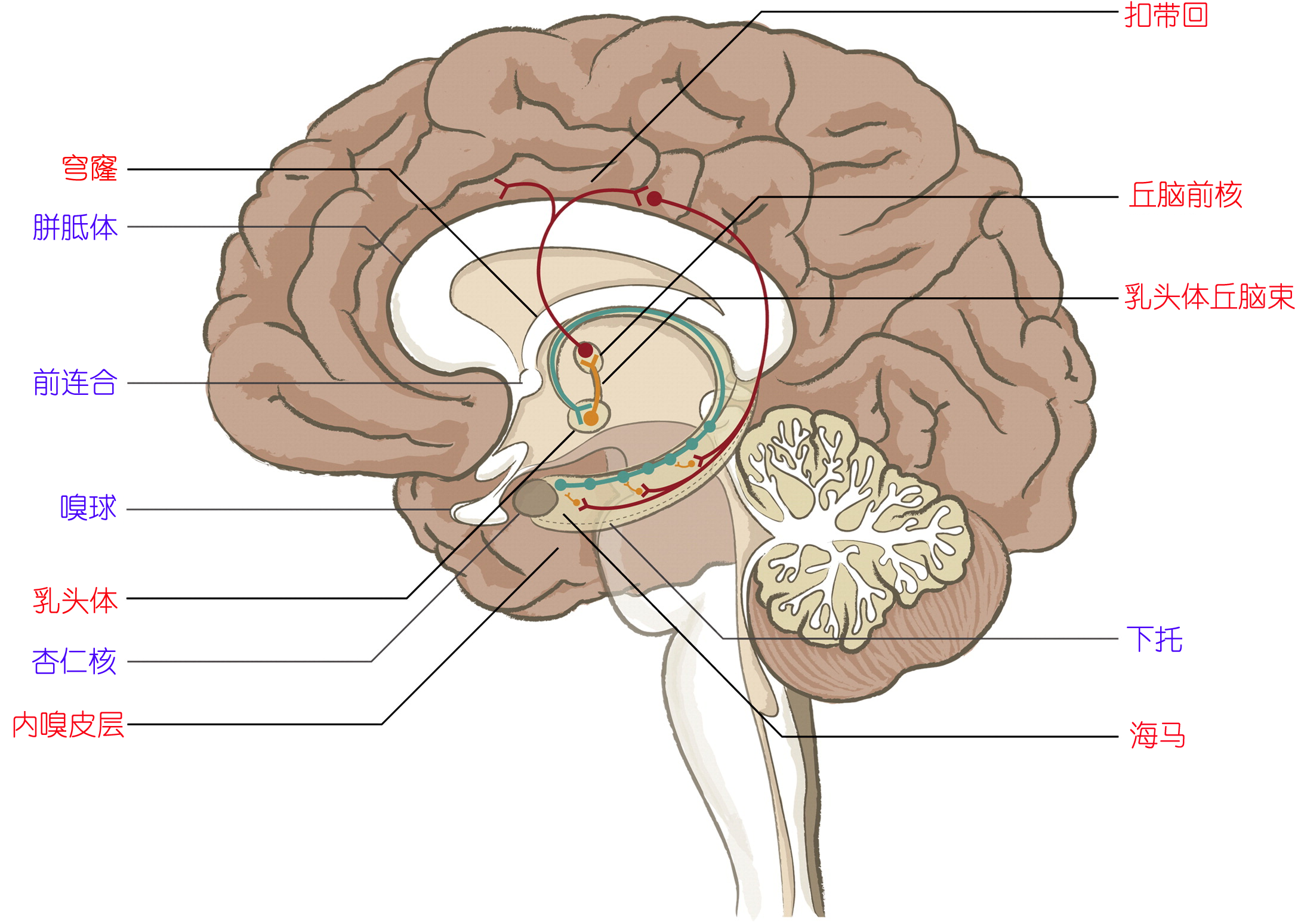 Papez环路1937年由美国神经解剖学家帕佩兹(J.W.Papez)首先提出,是指起源于海马的神经通路,经乳头体、丘脑前核和扣带回的中继,返回海马构成的封闭环路[海马→穹窿→乳头体→乳头体丘脑束→丘脑前核→扣带回→内嗅皮层→海马],这一边缘环路又名Papez环路(Papez circuit),可作为情绪表达的神经基础。目前研究认为,Papez环路是一个重要的与学习、记忆密切相关的脑结构。