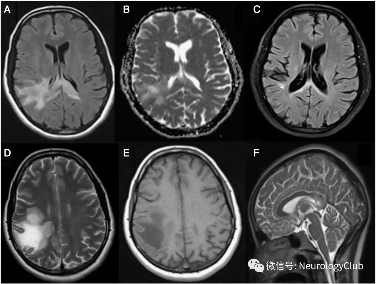 (图:FLAIR[A],T2WI[D]和T1WI[E]可见额顶叶较大的皮质-皮质下病灶伴坏死,累及胼胝体压部;病灶在ADC上呈高信号[B];矢状位FLAIR[F]可见肿瘤样病灶位于胼胝体压部;12月后复查FLAIR[C]可见脑萎缩伴残留的额顶叶和胼胝体高信号)