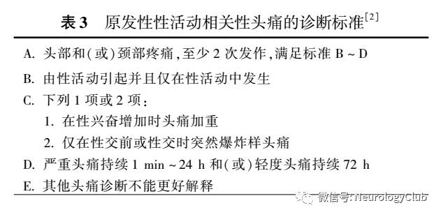 2004年,第二版头痛国际分类中给出了原发性活动相关性头痛的诊断标准。随着临床病例的扩展,PCH和PEH的诊断标准受到了质疑。而且将PHASA分为性高潮前头痛和性高潮性头痛,临床上二者很难区分。2013年在国际头痛分类第三版中又对其进行了修订,详见表1-3。
