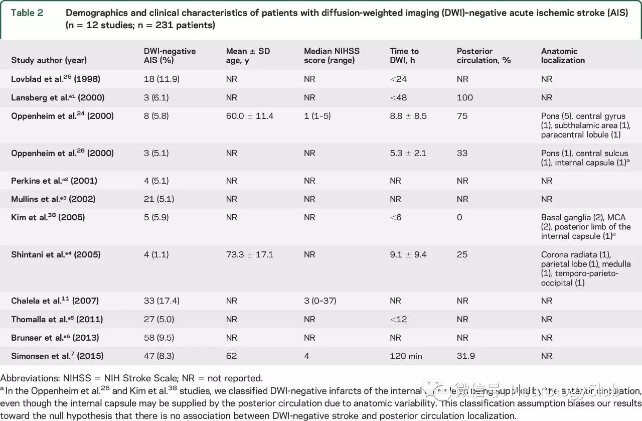 所有研究中只有1项研究探讨了小卒中体积(通过后续的DWI扫描)与DWI阴性之间的相关性,因此不足以进行荟萃分析。在该研究中,脑梗死病灶的平均体积为0.19±0.16cm3(极值0.05-0.5cm3)。
