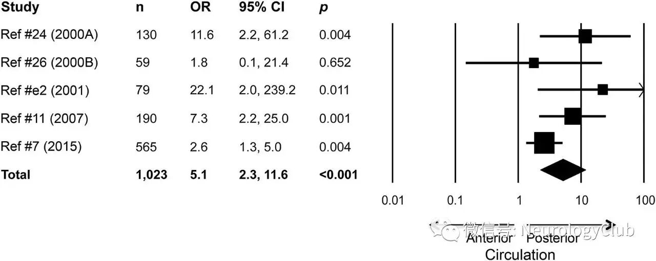 12篇研究中有5篇报导了DWI阴性脑梗死患者的前后循环比例。对此5篇研究进行荟萃分析,结果显示DWI阴性脑梗死患者中后循环缺血与前循环缺血的比例为5.1(95%CI 2.3-11.6,p<0.0005)(如图)。因此,DWI阴性脑梗死中后循环缺血5倍于前循环缺血。剔除每个研究的敏感性分析结果范围为4.3(95%CI 2.0-9.2)至8.1(95%CI 3.4-18.9)(p<0.05)。