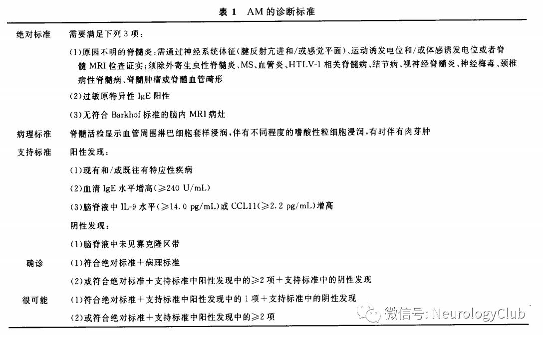 Kira研究组的研究设计比较严谨,除通过AQP4抗体检测排除视神经脊髓炎外,还要求随访至少5年以保证MS组是以脊髓受累为主的MS,同时排除多种以脊髓受累为主的其他疾病,使研究人群局限于典型的AM和典型的脊髓受累为主的MS。两组均询问有无特应性疾病并进行了过敏原特异性IgE、血清IgE水平、脑脊液IL-9和CCL11水平和脑脊液寡克隆区带检测,并结合多个指标形成诊断标准。作者在其文章中讨论了选择指标形成诊断标准的思路。Kira研究组制定AM诊断标准的目的在于区分脊髓炎是由AM所致还是由MS所致,而非区分特应性疾病引起的中枢神经系统损害与MS,因此在研究设计时严格控制纳入过程并将排除其他疾病列入诊断标准,从而使所制定的诊断标准具有较高的敏感性和特异性。就像多个版本的MS诊断标准所提出的一样:在临床符合临床孤立综合征的情况下MS诊断标准才能具有较好的敏感性和特异性,鉴别诊断是重要的除外标准,但首先临床发病情况是炎症性脱髓鞘性质。但同时严格的纳入过程也使该标准的使用受到限制。