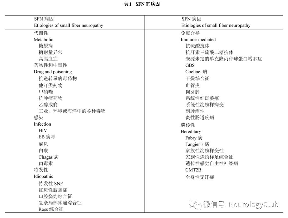 SFN的常见病因包括遗传性因素,如家族性淀粉样变、 常染色体隐性遗传性周围神经病、遗传性感觉性自主神经病、Fabry病、Fridreich共济失调等;获得性因素,如糖尿病、糖耐量异常、酒精中毒、系统性淀粉样变、血管炎、干燥综合征、人类免疫缺陷病毒感染等。但是有很多临床表现为SFN的患者没有明确病因,尤其是老年人,大约93%患者没有明确病因,属于特发性。