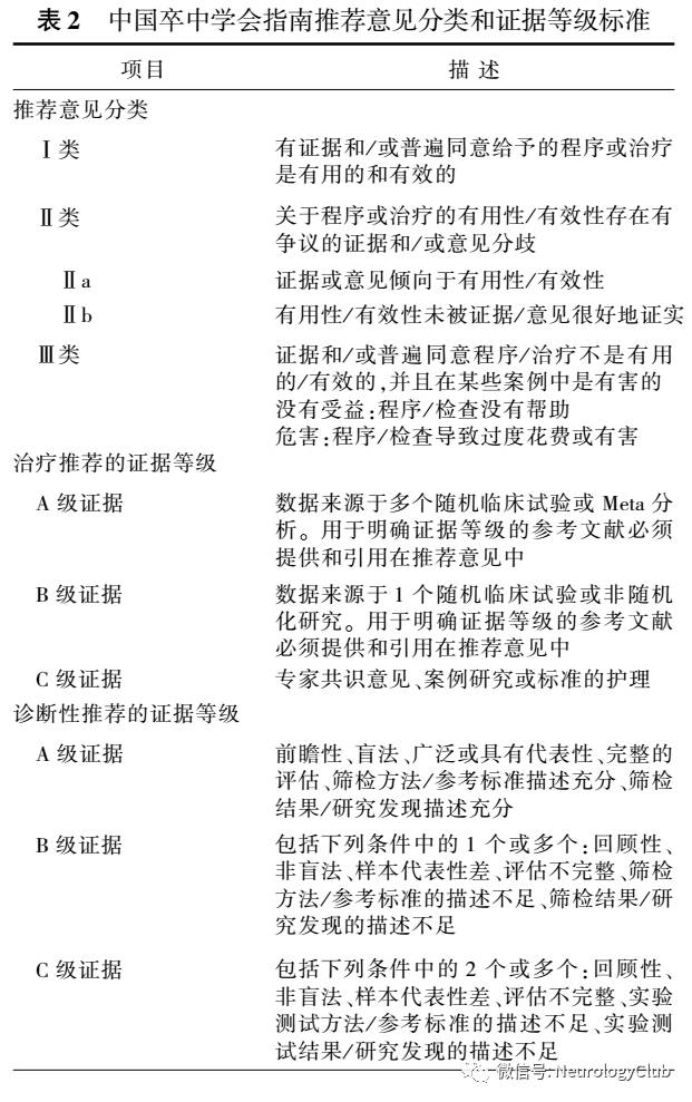 推荐建议(中国卒中学会指南推荐意见分类和证据等级标准见表2)