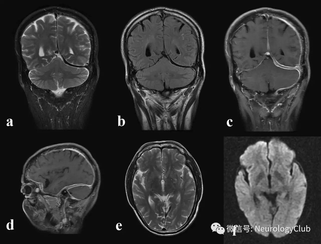 图1:特发性肥厚性硬脑膜炎患者;可见肥厚的硬脑膜在T2WI(a,e)上呈低信号,FLAIR(b)和DWI(f)上亦为低信号;T1增强(c,d)可见硬脑膜(左侧>右侧)明显不对称性强化;左侧小脑幕处硬脑膜中心线样无强化,两侧周边轨道样强化,即“轨道征”