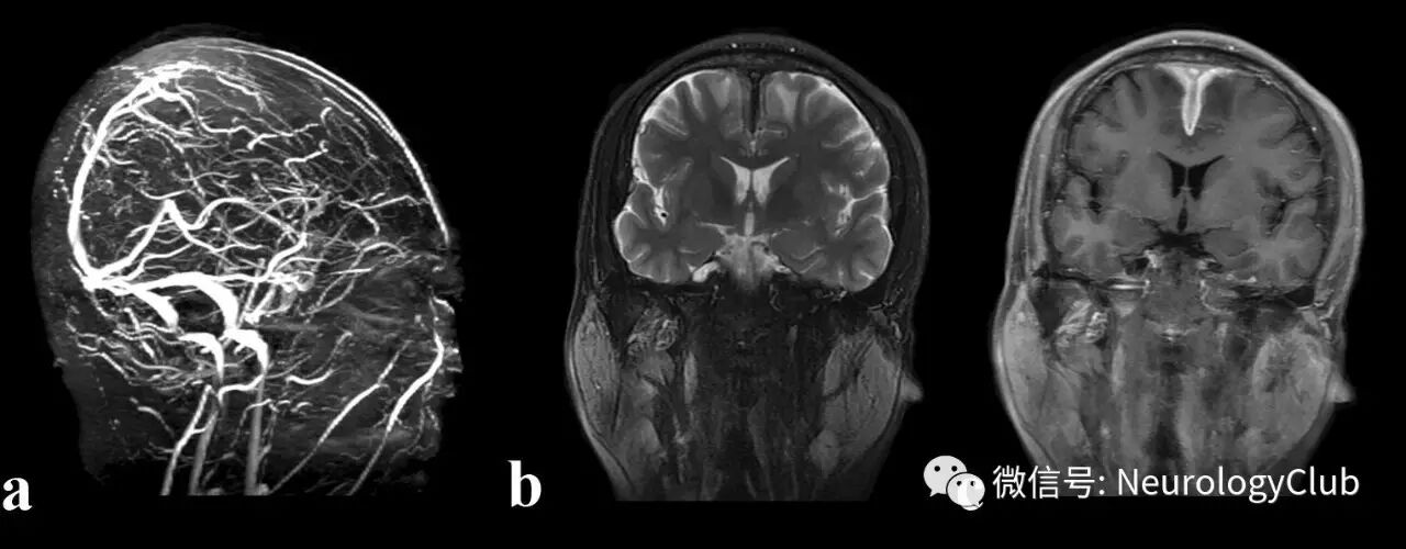 图2:特发性肥厚性硬脑膜炎患者;a:MRV可见上矢状窦闭塞;b:T2WI可见双侧额叶静脉性梗死;c:T1增强可见硬脑膜增厚强化