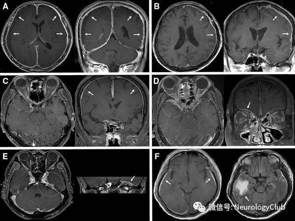 图7:ANCA相关性肥厚性硬脑膜炎患者;A-B:对称或不对称的弥漫线样硬脑膜增厚并强化;C-D:对称或不对称的硬脑膜增厚强化连续延伸至眼眶结构;E:沿左侧颈动脉管和蝶骨底部的局灶性结节样非对称强化伴硬膜增厚;F:弥漫线样非对称性硬脑膜增厚强化(左,T1增强)伴右侧颞叶脑实质浸润(右,FLAIR)
