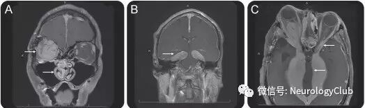 图9:IgG4相关性肥厚性硬脑膜炎患者;A:T1增强可见鼻咽部和眼眶炎性假瘤形成;B:小脑幕弥漫增厚强化,形成瘤样肿块;C:肥厚性硬脑膜炎侵入眼眶,中脑和视神经明显受压