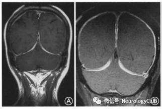 图3:IgG4相关性肥厚性硬脑膜炎患者;A:可见硬脑膜弥漫强化;B:硬脑膜左侧较右侧增厚更为明显