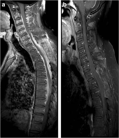图12:IgG4相关性肥厚性硬脊膜炎患者;a:可见C2-T9水平弥漫硬脊膜增厚强化;b:治疗6月后病灶较前好转