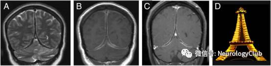 图6:夜间埃菲尔铁塔征。A:T2WI;B:T1增强;C:3年后复查的T1增强;D:夜间埃菲尔铁塔