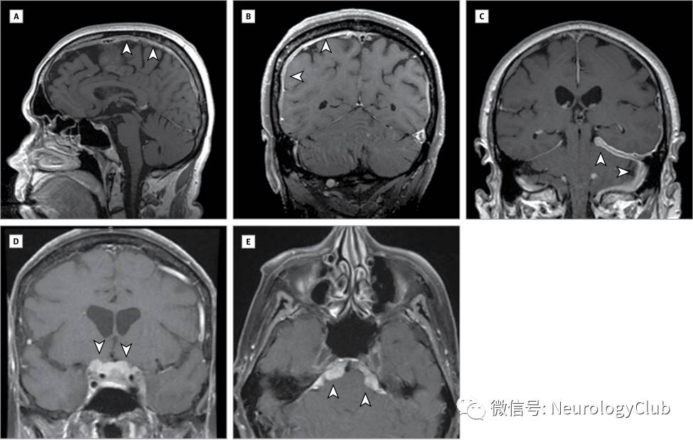 图4:IgG4相关性肥厚性硬脑膜炎患者;A-C:硬脑膜增厚,线样强化;D-E:硬脑膜结节状强化