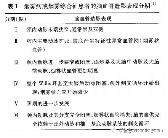 建议采用广泛接受的Suzuki分期,根据脑血管造影表现将烟雾病分为6期(表1),双侧的病变分期可能不同。典型的发展过程多见于儿童患者,而且可以停止在任何阶段。