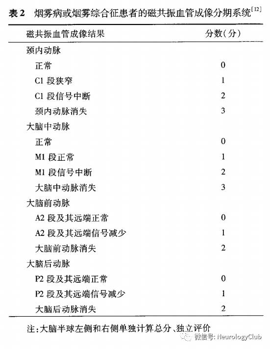 2. MRI和MRA的表现:(1)ICA末端和(或)ACA和(或)MCA起始段狭窄或闭塞。(2)基底节区出现异常血管网(在1个扫描层面上发现基底节区有2个以上明显的血管流空影时,提示存在异常血管网)。(3)上述表现为双侧性,但双侧的病变分期可能不同(分期标准参考表2)。