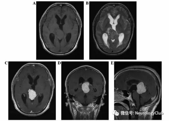 常规血化验无殊。头颅MRI可见边界清楚的肿块伴梗阻性脑积水,位于松果体区,延伸至三脑室,压迫中脑顶盖部。T1WI呈等信号(图1A),T2WI为不均匀高信号(图1B)。注射对比剂后呈均匀强化(图1C-E)。初步诊断考虑松果体生殖细胞瘤或松果体细胞瘤。