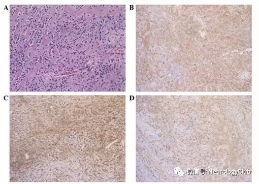 (图1:A:T1WI可见等信号病灶;B:T2WI上为不均匀高信号;C-E:T1增强可见病灶均匀明显强化)