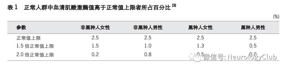 在实际的临床工作中,临床医生往往会忽视略高于ULN(第97.5百分位值)的实验室检测结果,而一般情况下也不会带来不良的临床结局。根据荷兰研究的结果,指南推荐将启动针对肌肉疾病进行筛查的临界点设定为血清CK ULN的1.5倍,而不是ULN,如此可使筛查人数减少约50%,可以极大地提高筛查的特异度,且敏感度的降低有限(表1)。2013年的一项挪威人群研究对这项推荐意见进行了验证,支持将血清CKULN的1.5倍作为筛查临界点。