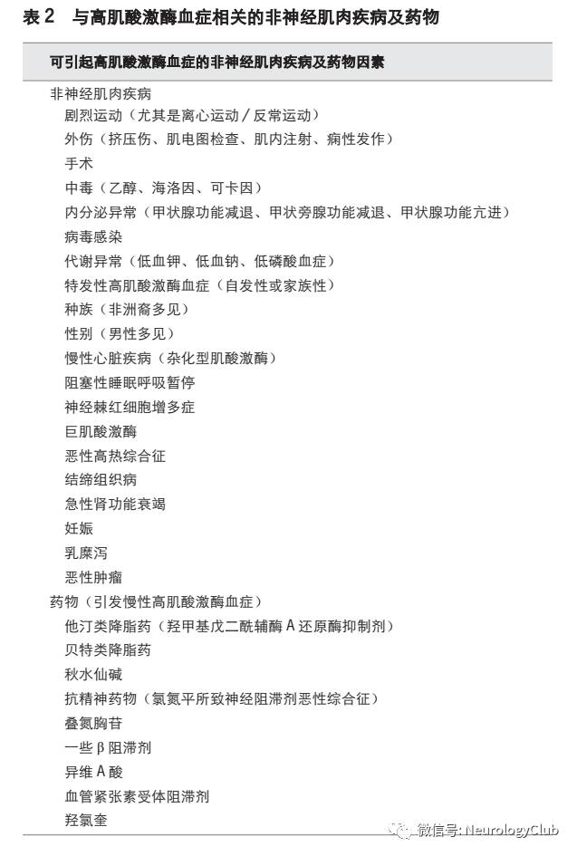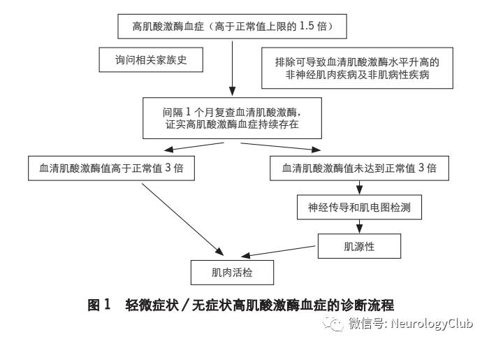 血清CK值升高可以出现在无原发性神经肌肉疾病的患者中(表2)。指南推荐了一个针对轻微症状/无症状高CK血症患者在无法对其高CK血症作出医学解释时进行诊断的流程,旨在筛选出需要接受肌肉活检的患者(图1)。