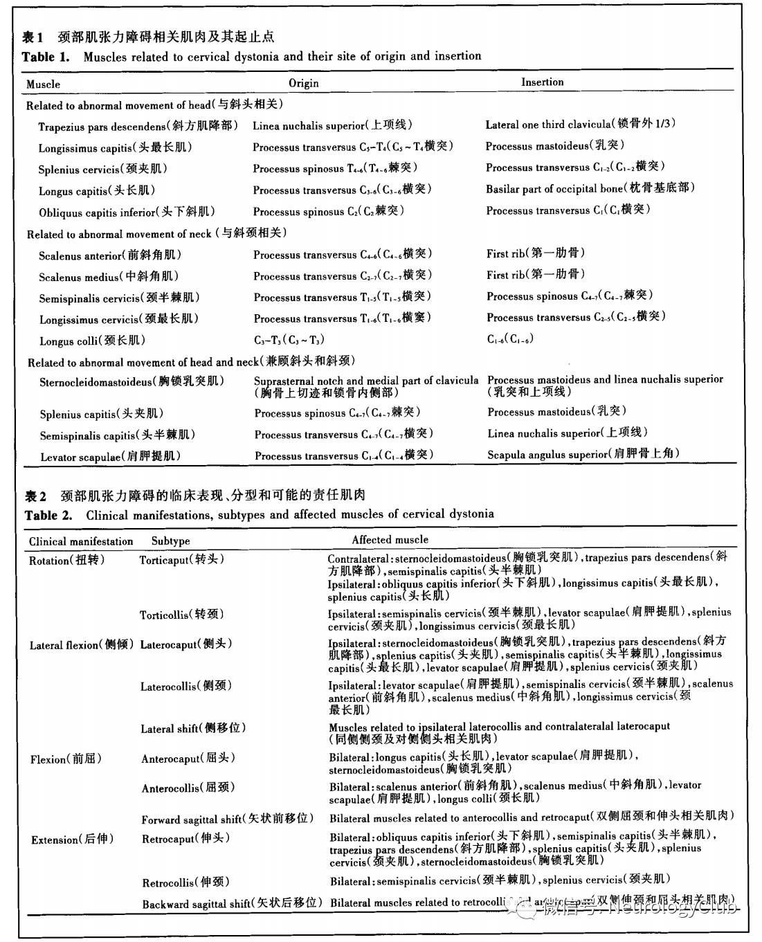 “头-颈”概念引入后,颈部肌张力障碍可以分为8种基本类型,有助于临床医师对头颈部异常运动的精确分析,特别是在移位的判断上更有帮助,进而有助于肉毒毒素治疗靶肌肉的选择。颈部肌张力障碍的精准治疗,特别是复杂颈部肌张力障碍,需超声联合肌电图以识别和定位靶肌肉,从而提高治疗有效率,减少不良反应。