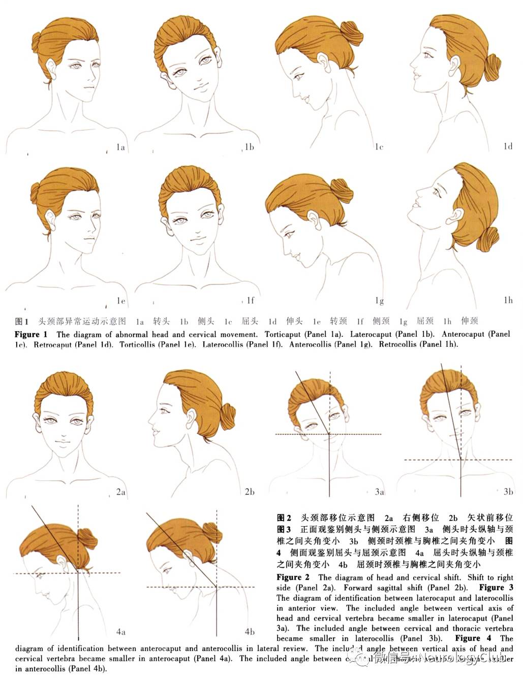 之间夹角变小,而屈颈时颈椎与胸椎之间夹角变小(图4);类似的,伸头时头纵轴与颈椎之间夹角变小,而伸颈时颈椎与胸椎之间夹角变小。鉴别转头与转颈最为困难,可以通过观察喉结与中线的位置关系以粗略判断。转头时喉结基本位于身体中线,而转颈时喉结往往偏离中线位置。利用直立位颈椎CT或MRI对斜头和斜颈进一步分析,对比高位(C2层面)和低位(C7层面)颈椎的位置,可以对颈部肌张力障碍进行精确判断。但常规CT或MRI需患者处于平卧位,对异常姿势的判断可能产生影响,需在特殊的立位CT或MRI下完成。