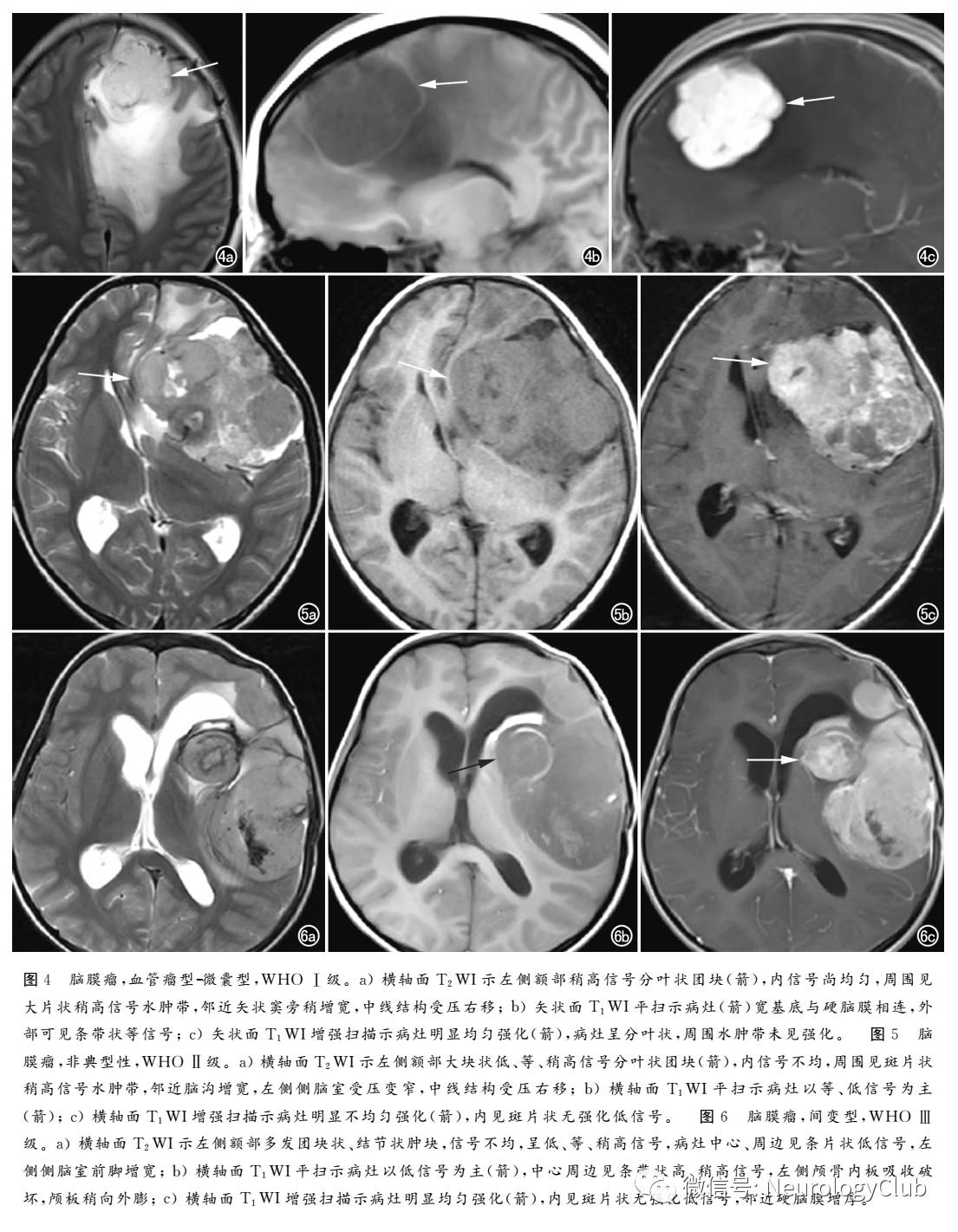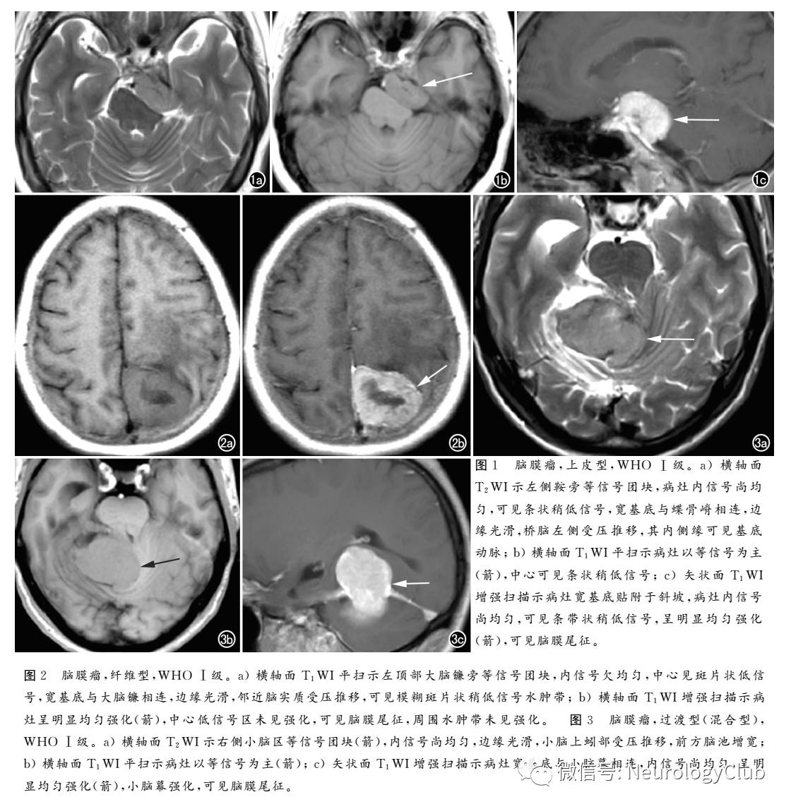 脑膜瘤常表现为颅内圆形、类圆形、不规则形肿块,T1WI呈中等或中低信号,T2WI呈中等或稍高信号,邻近脑皮质受压;增强扫描呈明显均匀、不均匀强化,可见脑膜尾征、假包膜征、瘤周水肿、脑实质挤压征、囊变、出血、钙化、瘤内血管征以及邻近骨质增生或侵蚀性改变等。虽然上述征象为大部分脑膜瘤的共性表现,但随着脑膜瘤组织学类型及分级的不同,各种类型之间MRI表现也有所差异。