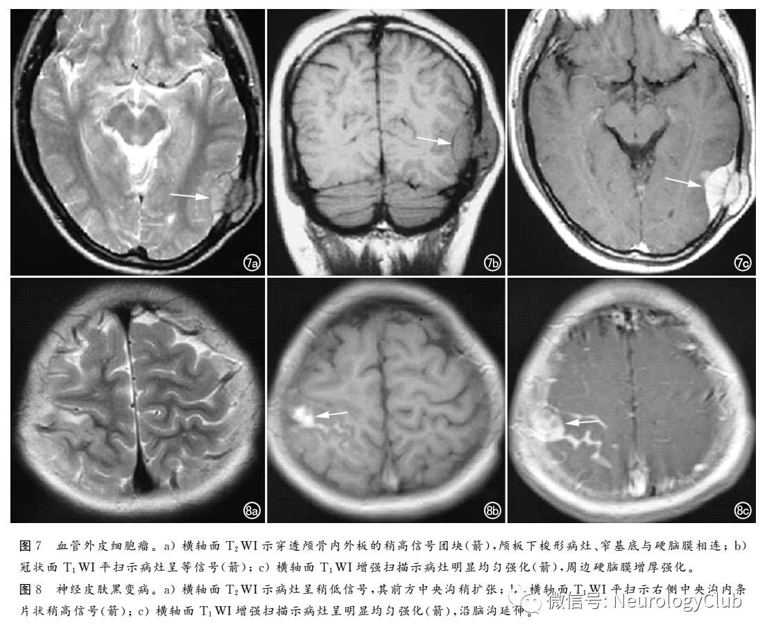 弥漫性黑色素细胞增生症是一种十分罕见的神经皮肤综合征,表现为原发性脑膜弥漫性或局限性肥厚和色素沉着,并伴有巨大皮肤黑色素痣。MRI表现为脑脊膜增厚,T1WI上信号强度增强,MRI增强扫描对脑膜黑色素瘤的诊断有一定价值,常表现为弥漫性或局灶性软脑膜或硬脑膜强化、脑积水以及脑组织表面的小瘤灶(图8)。