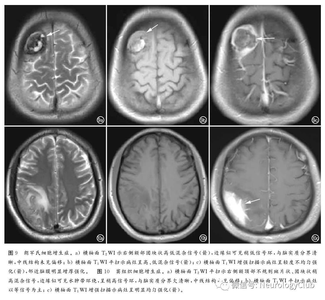 窦组织细胞增生症(Rosai-Dorfman病)是一种罕见的良性组织细胞增生性疾病,病理学上表现为不同形态的组织细胞、大量成熟的浆细胞和淋巴细胞组成“明暗”相间的区域。中枢神经系统结外Rosai-Dorfman病病变主要位于大脑凸面、矢状面、鞍上、海绵窦和岩骨斜坡区。超过90%的病变附着于脑膜,病变范围常较大,T1WI多表现为等信号,T2WI为不均匀等或低信号,增强扫描呈明显均匀强化,病变周围多伴中至重度水肿(图10)。