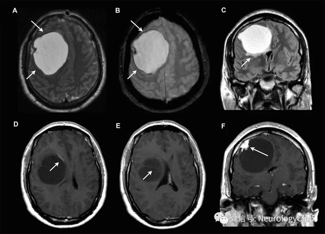 (图:MRI可见右额叶囊性病灶;A-B:T2WI;C:FLAIR;D-F:T1增强)
