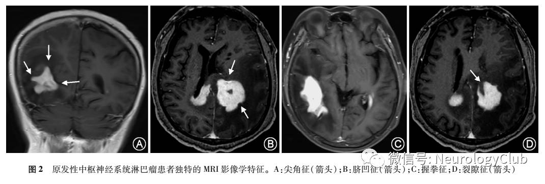4. MRI表现:T1WI呈等或稍低信号,T2WI多数呈等或稍高信号,少数为低或混杂信号,FLAIR呈稍高信号,DWI可呈等、略高或高信号,而表观弥散系数(apparent diffusion cofficient,ADC)相应区域多为低信号。此外,研究发现PCNSL在DWI上信号往往高于胶质瘤,ADC值低于胶质瘤,分析其原因可能与PCNSL独特的病理学特点相关。注射造影剂后(图1),大多呈结节样、团块状或斑片状均匀强化,部分出现不均匀、环形、开环样强化,少数强化不明显;累及胼胝体时表现为“蝶翼征”;侵犯室管膜时呈弥漫粟粒结节样或带状强化;播散至脑膜或脑膜原发PCNSL时,除见脑膜弥漫性强化外,少可见“脑膜尾征”。PCNSL强化原因与其他富血管肿瘤不同,PCNSL为乏血管肿瘤,镜下瘤细胞围绕血管生长,浸润并破坏血管壁,血脑屏障受损,故明显强化。“尖角征”“脐凹征” “握拳征”“裂隙征”或“卫星灶征”等独特的影像学特征(图2),可与肿瘤各部分生长速度不一致或血管阻挡相关。肿瘤很少出现坏死、囊变、出血和钙化。