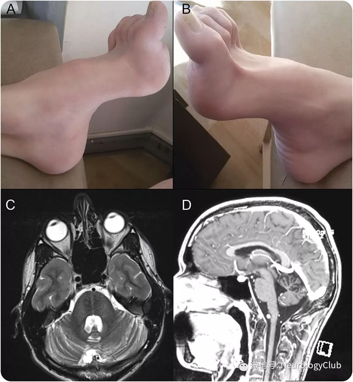 (图:Friedreich样弓形足[A,B]和提示性MRI发现:脑桥T2WI线样低信号[典型表现,C]以及小脑萎缩[非特异性,D])
