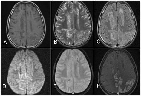 (图:A:T1WI;B:T2WI;C:FLAIR;可见双侧顶叶和枕叶曲线样高信号皮层病灶;D:DWI上可见轻度脑回弥散受限;E:梯度回波序列可见病灶伴出血;F:增强T1可见脑回样强化病灶)