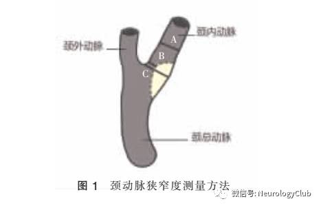 1. 颈动脉狭窄程度的测量:多数研究采用的评价颈动脉狭窄程度的方法为欧洲颈动脉外科试验法(European Carotid Surgery Trial,ECST)和北美症状性颈动脉内膜切除试验法(North Ameriean Symptomatic Carotid Endarterectomy Trail,NASCET)两种,都采用相同的狭窄分度方法,根据血管造影颈动脉内径缩小程度将颈内动脉的狭窄程度分为4级:(1)轻度狭窄:<30%;(2)中度狭窄:30%-69%;(3)重度狭窄:70%-99%;(4)完全闭塞:闭塞前状态测量狭窄度>99%。NASCET法采用颈动脉膨大部以远正常处管腔内径为基础内径(A),ECST法采用颈动脉膨大处模拟内径为基础内径(C),两者都采取颈内动脉最窄处宽度(B)为测量的基准(图1)。NASCET法狭窄度=(1-B/A)×100%(如颈内动脉分叉后全程狭窄,则取对侧颈动脉作比较),ECST法狭窄度=(1-B/C)×100%,ECST的80%-99%的狭窄大致和NASCET的70%-99%的狭窄相对应,本指南推荐采用NASCET法测量狭窄度。
