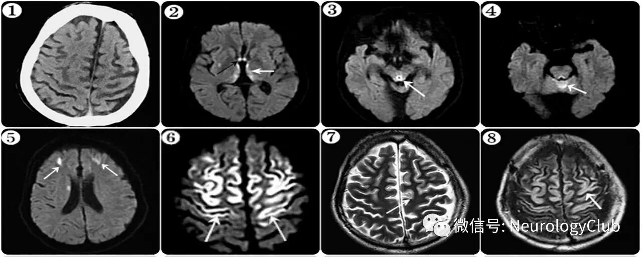 (图:①:CT未见明显异常;②-⑥:DWI;⑦:T2WI;⑧:FLAIR;MRI可见双侧额顶叶、内侧丘脑、三脑室旁、小脑蚓部以及导水管周围区域对称性弥散受限病灶)