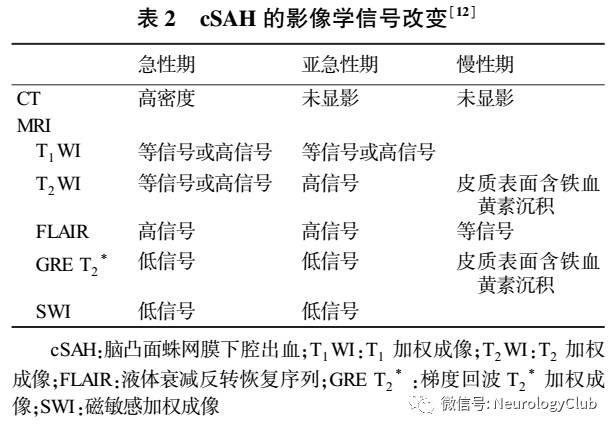 MRI对于cSAH的病因诊断尤为关键,其对少量SAH的敏感性较其他检查更高,包括液体衰减反转恢复序列(fluid attenuated inversion recovery,FLAIR)、梯度回波T2*加权成像(gradient-echo T2*-weighted imaging,GRE-T2*WI)、弥散加权成像(diffusion-weighted imaging,DWI)、磁敏感加权成像(susceptibility-weighted imaging,SWI)等(表2)。
