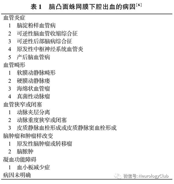 除上述病因外,还存在一些可引起各种类型SAH的罕见病因,其引起的cSAH缺乏特定的影像学表现,仅有个别相关临床案例支持,例如硬脊膜动静脉瘘、真菌性动脉瘤等血管畸形、软脑膜转移瘤等原发或继发脑肿瘤、继发于多种原因的血小板减少综合征等凝血功能障碍。这些罕见病因引起cSAH的临床和影像学特征需要对更多病例进行归纳和总结。