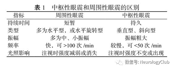 3.3 自发性眼震 嘱患者固定头位,眼球随目标方向移动。一般从正中开始,分别向左、右、上、下的顺序进行检查。要注意观察眼震的方向、幅度等,前庭性眼震有明确的方向,如果出现眼震性质的变化多属于中枢性眼震。检查时要注意避免光线直射患者的眼睛。中枢性眼震和周围性眼震的区别见表1。