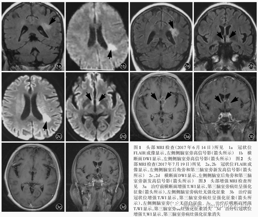 患者女性,62岁,因头晕、恶心、睡眠增多2月余伴精神行为异常1个月,于2017年8月10日入院。患者2月余前(2017年5月25日)乘坐汽车途中出现头晕,恶心,呕吐胃内容物2次,自觉双下肢无力,持续不缓解,但自主行走不受影响;此后逐渐出现精神较差,睡眠增多,自发言语减少。当地医院行头部CT检查未见明显异常,临床诊断为“脑供血不足”,予氯吡格雷静脉滴注(具体剂量不详),症状无明显改善。遂转诊至上级医院,实验室检查(6月12日)血清钠131.90mmol/L(135-145mmol/L);头部MRI检查(6月14日)显示,左侧侧脑室后角旁新发梗死灶,双侧额叶软化灶,周围神经胶质增生(图1);MRA显示,左侧大脑后动脉轻度局限性狭窄,临床考虑“缺血性卒中”,予补钠和改善循环治疗(具体方案不详),头晕和恶心症状好转,但睡眠进一步增多,唤醒后对答切题,出现自言自语,似梦呓,间断性出现右肩抖动、右手摸索动作和反复咂嘴动作,行走时右下肢拖曳。此后嗜睡症状进一步加重,当地医院复查血清钠为122mmol/L(7月12日),予以补钠治疗后恢复至正常水平,但临床症状无明显改善。此后出现低热,体温最高37.3℃,无咽部疼痛、咳嗽、咳痰、流涕,无尿频、尿急、腹泻,当地医院复查MRI(7月19日)显示,左侧侧脑室后角旁、第三脑室周围异常信号影(图2),间断发热,体温最高39.5℃,但无汗,伴咳嗽,胸部CT可见双下肺斑片状渗出影,予头孢曲松钠治疗(具体剂量不详)效果欠佳,高热时予物理降温后体温恢复正常,嗜睡症状进一步加重,唤醒后不识家人,自发言语明显减少且对答不切题。遂于8月2日至我院急诊就诊。体格检查:嗜睡,呼之可睁眼,对答不切题,双侧瞳孔等大、等圆,直径3mm,对光反射灵敏,余脑神经检查未见异常;四肢肌力>3级、肌张力正常,腱反射可引出,双侧病理征阴性,颈项稍强直,颏胸距2横指。8月4日出现发热1次,体温最高38.4℃,物理降温后体温恢复正常。实验室检查:血清免疫学指标抗水通道蛋白4(AQP4)抗体阳性(1∶32);自身抗体谱抗干燥综合征A型抗体(SSA)、抗Ro52抗体弱阳性(Western blotting法),抗甲状腺过氧化物酶(TPO)抗体49.04IU/ml(<34IU/ml)、抗甲状腺球蛋白(TG)抗体122.10IU/ml(<115IU/ml)。腰椎穿刺脑脊液检查(8月7日)外观清亮、透明,压力正常,白细胞计数为8×106/L[(0-5)×10^6/L]、单核细胞计数8×106/L[(0-5)×10^6/L],蛋白定量690mg/L(250-450mg/L),葡萄糖和氯化物正常;细胞学白细胞计数800/0.50ml,激活淋巴细胞阳性;髓鞘碱性蛋白(MBP)1.03nmol/L(≤0.55nmol/L),特异性寡克隆区带(SOB)阳性,抗N-甲基-D-天冬氨酸受体(NMDAR)抗体阳性(1∶100),抗AQP4抗体可疑阳性,副肿瘤相关抗体抗Hu、Yo、Ri抗体阴性,细菌、病毒抗体和真菌培养阴性。头部MRI增强扫描显示,下丘脑和双侧丘脑病灶强化(图3a,3b)。急诊考虑抗N-甲基-D-天冬氨酸(NMDA)受体脑炎,予静脉注射免疫球蛋白(IVIg)0.40g/(kg·d),次日收入院。患者自发病以来,睡眠增多,食欲可,食量增加,若不制止可一直进食,可自主排尿、排便,深睡时偶有大小便失禁,体重无明显下降,无眼干、口干、光过敏、雷诺现象、关节疼痛、口腔和外阴溃疡等免疫性疾病相关表现。