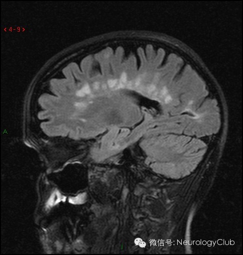 2、特征:病灶以带毛缘的形态自胼胝体向外延伸,“虫蚀样”或称道森指征(Dawson’s finger sign)