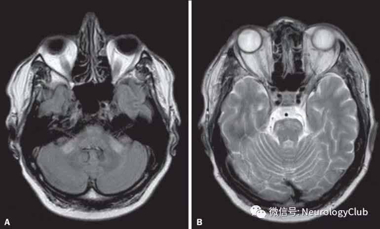 (图4:神经白塞病患者;FLAIR和T2WI可见双侧小脑和脑桥高信号病灶)