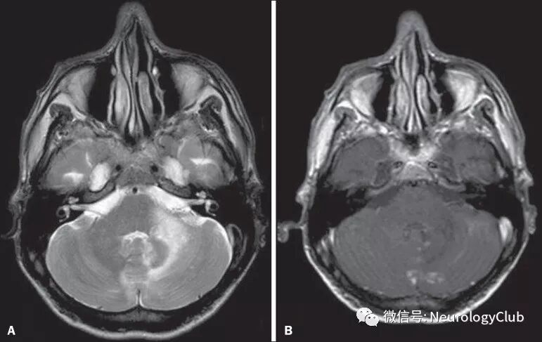 Moragas等报道的李斯特菌菱脑炎MRI异常达100%(幕下病变100%,幕上病变50%),而PNS所致菱脑炎患者MRI均正常。在病毒所致的菱脑炎中,70-75%的EV 71感染患者,50%的西尼罗河病毒感染患者,2/3合并疱疹感染患者(单纯疱疹病毒,Epstein-Barr病毒,巨细胞病毒,水痘-带状疱疹病毒和人类疱疹病毒6型)以及几乎100%的BD患者可见MRI异常信号。T2/FLAIR高信号病灶主要位于脑桥,延髓,上颈髓和小脑,而中脑累及少见。