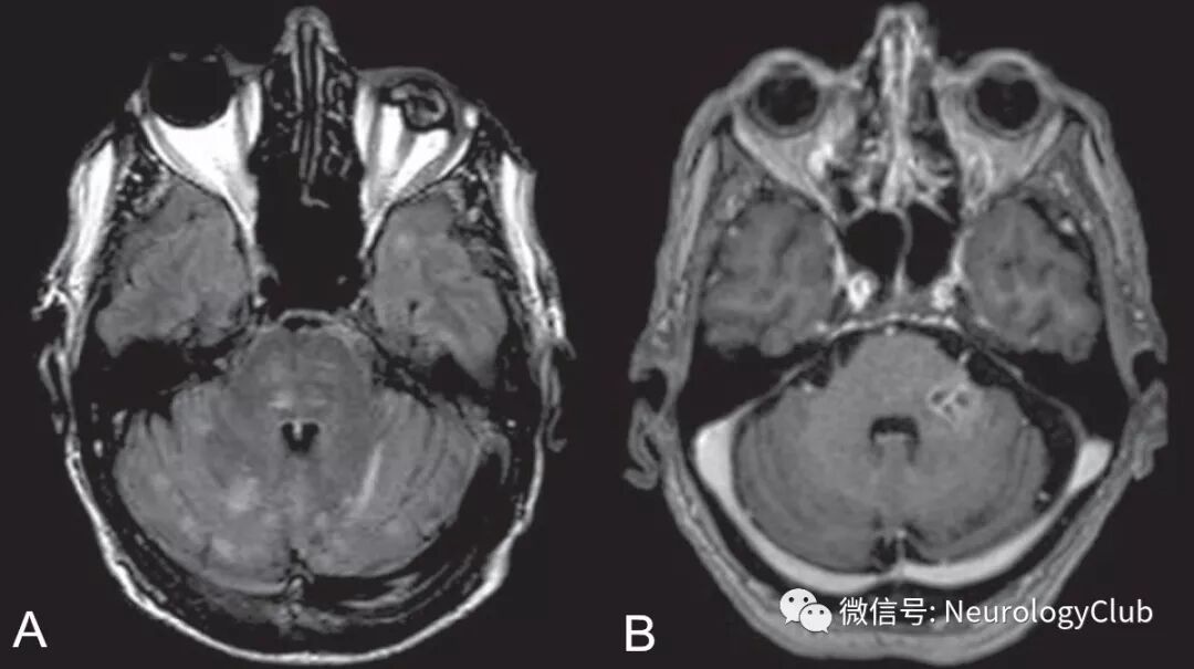 (图3:李斯特菌菱脑炎患者;A:FLAIR可见不规则,边界不清的多发高信号病灶;B:增强T1可见左侧脑桥环形强化病灶)