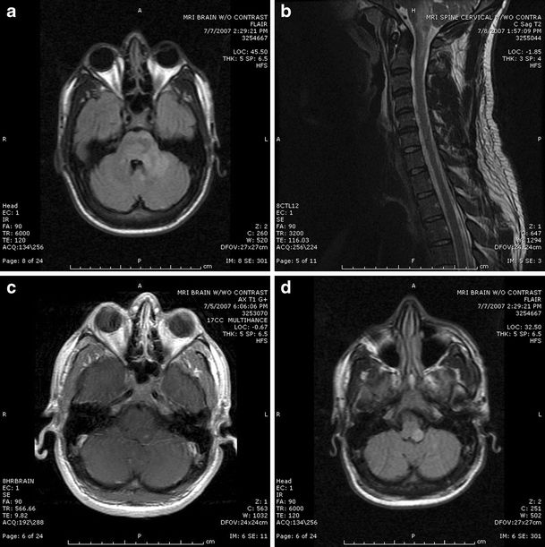 (图1:李斯特菌菱脑炎患者;a:FLAIR可见左侧小脑中脚,小脑和脑桥高信号病灶;b:T2WI可见病灶延伸至上颈髓;c:T1增强可见左侧脑桥后外侧病灶强化;d:FLAIR上可见左侧延髓后外侧病灶)