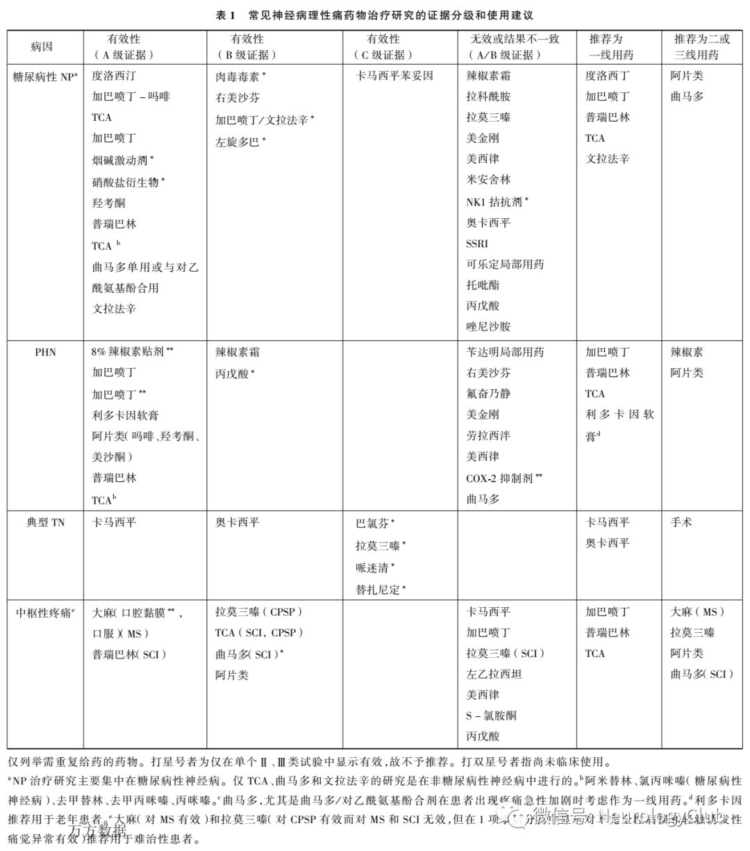 症状性TN 对于多发性硬化引起的TN,只有一些小样本的非盲法的IV类研究。一项小型的开放性研究亦显示肉毒毒素-A和某些抗癫痫药物有效(表1)。